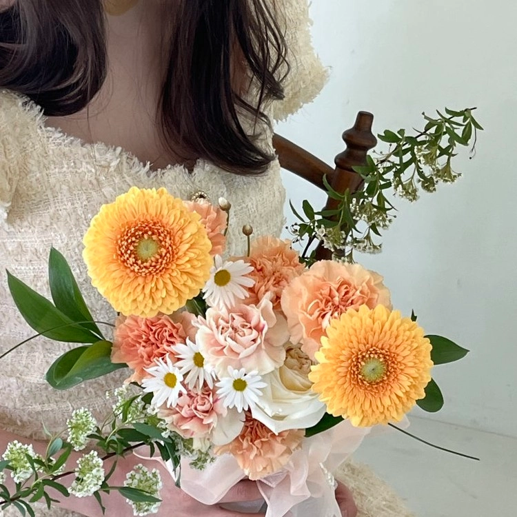 일반 카네이션 6송이 + 투톤 카네이션 3송이 + 거베라 2송이 + 일반 카네이션 5송이 + 투톤 카네이션 2송이 + 거베라 2송이 + 고급 장미 1송이 + 마가렛 + 조팝나무 믹스